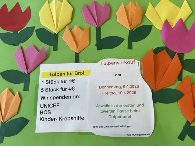 In diesem Jahr nahm die Schule zum 2. Mal an der Aktion "Tulpen für Brot" teil. Die Musikgarten-AG hat Tulpenzwiebeln gepflanzt und für einen guten Zweck verkauft.